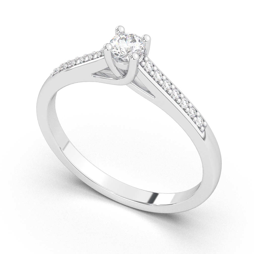 Zanimljiv verenički prsten od belog zlata u sebi kombinuje jednostavan i moderan stil. Centralni kamen se izdiže iznad osnove sa dva niza sitnih brilijanata, a postavljen je u vešto dizajnirano postolje od tankih zlatnih držača.