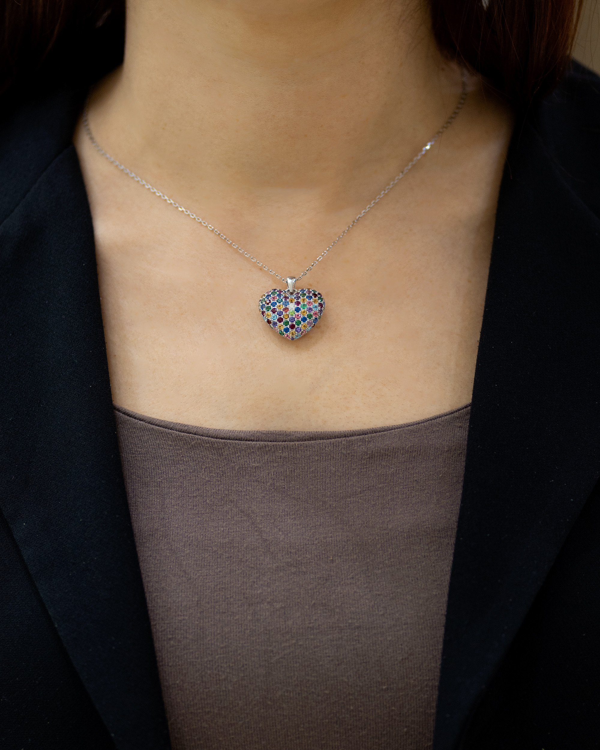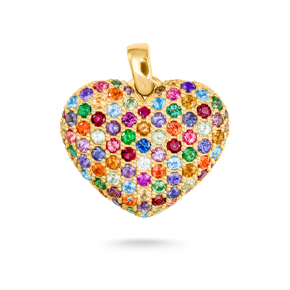Privezak od zlata u obliku srca, ukrašen sa 11 dragulja različite boje. Privezak je napravljen od najkvalitetnijeg 14-karatnog zlata i nema klasičnu alkicu za lančić. Zlatni privesci zlatare Andrejević mogu biti izrađeni u bilo kojoj od 3 boje zlata: beloj, roze, ili žutoj. Uz to, u zlatari Andrejević, nudimo Vam mogućnost da sami izaberete karatažu, čistoću i boju dijamanta kako biste bili sigurni da će privesci biti upravo onakvi kakve ste želeli.