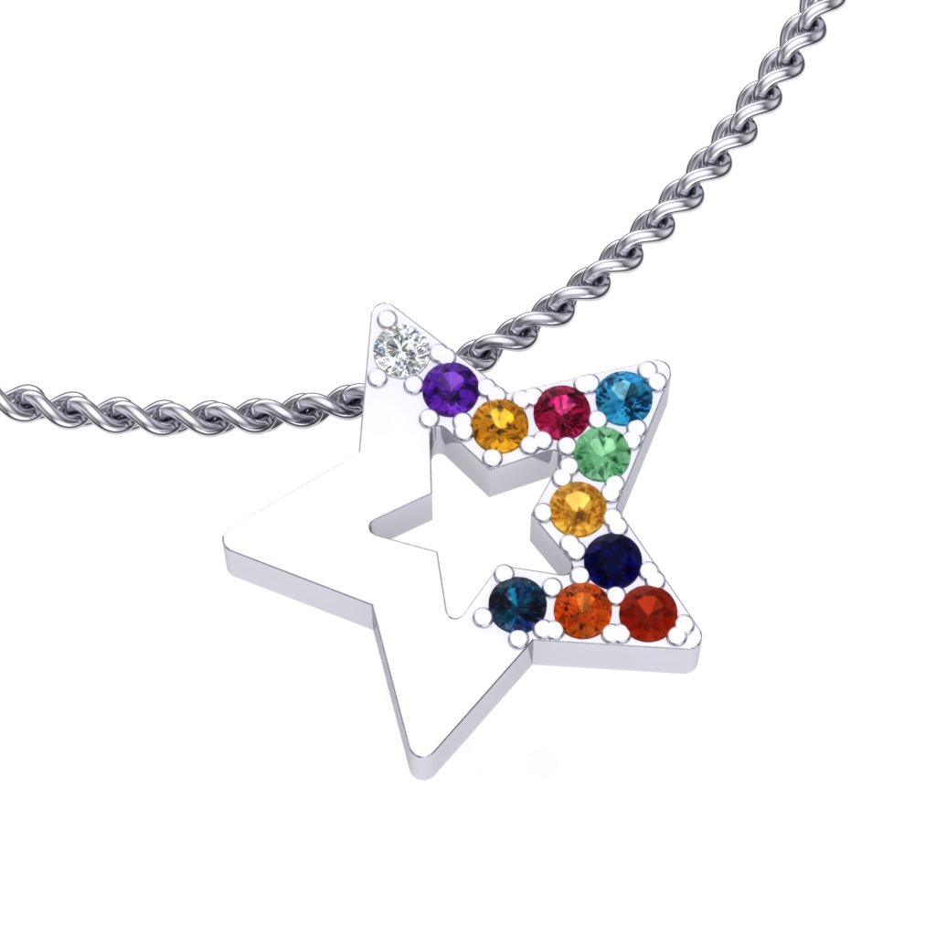 Privezak od zlata u obliku zvezde, ukrašen sa 11 dragulja različite boje. Privezak je napravljen od najkvalitetnijeg 14-karatnog zlata i nema klasičnu alkicu za lančić. Umesto toga, lančić izgleda kao da prolazi iza kraka zvezde. Zlatni privesci zlatare Andrejević mogu biti izrađeni u bilo kojoj od 3 boje zlata: beloj, roze, ili žutoj. Uz to, u zlatari Andrejević, nudimo Vam mogućnost da sami izaberete karatažu, čistoću i boju dijamanta kako biste bili sigurni da će privesci biti upravo onakvi kakve ste želeli.