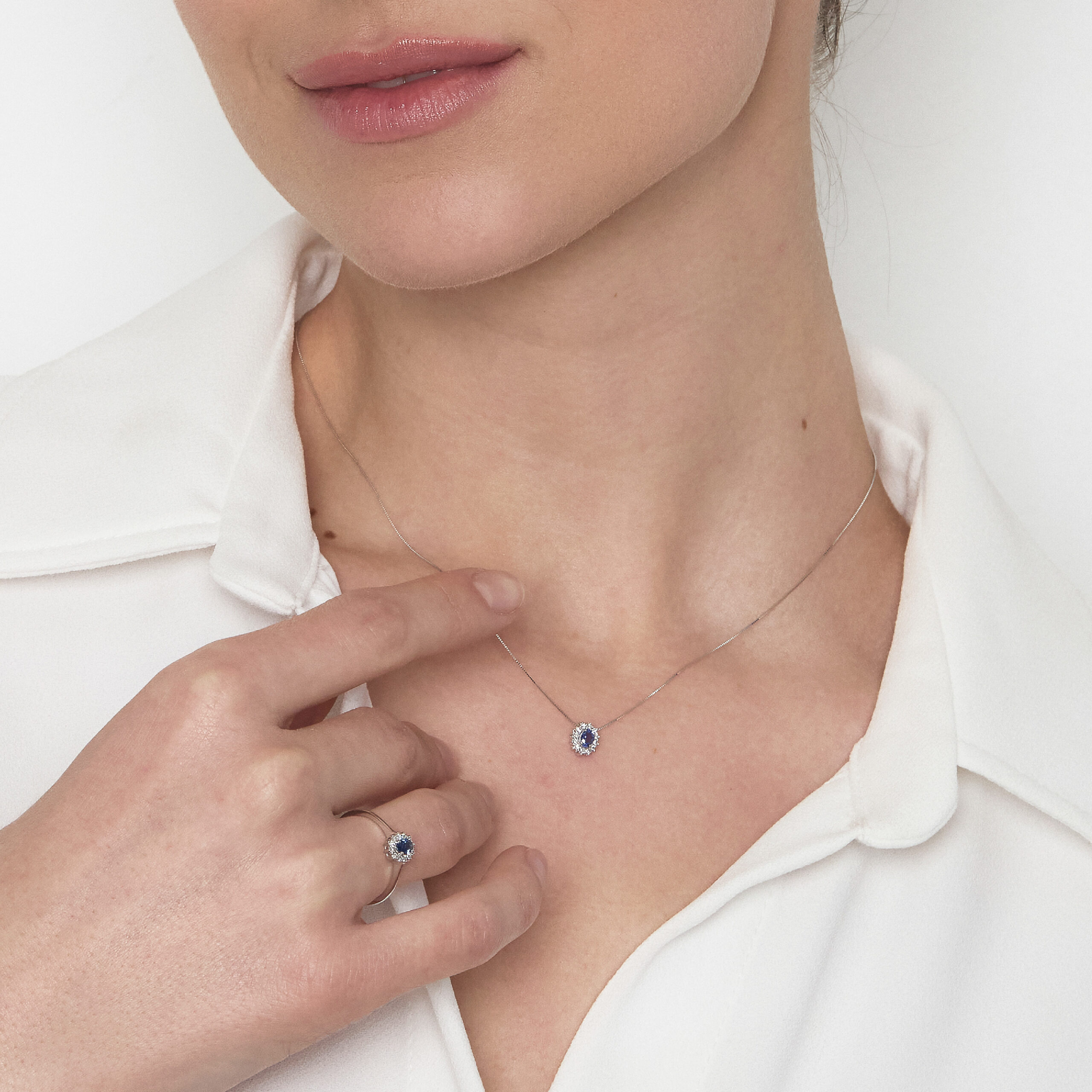 Prsten koji je odraz prefinjenog stila. Jedan od komada koji ne izlaze iz mode i koji se s ponosom porodično ostavljaju kasnijim generacijama. Za efekat neprolazne lepote zaslužni su plemenit metal i drago kamenje. Safir na prvi pogled osvaja dubinom, odnosno prvoklasnom obradom. Oko njega smešteni sitni brilijanti podsećaju na latice. Zaista poseban poklon zbog kog ćete pobrati sve simpatije.