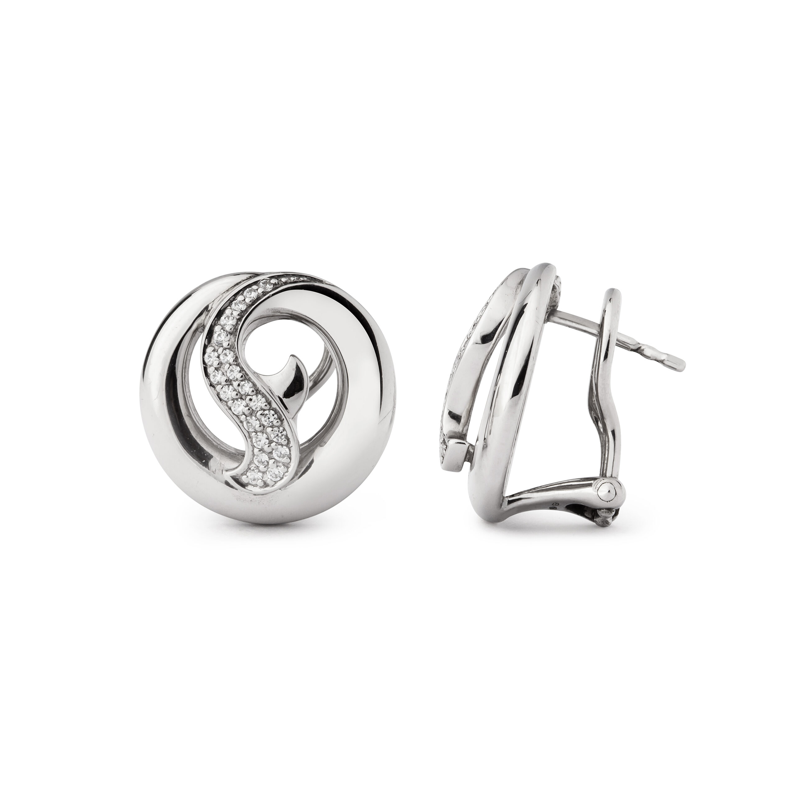 Minđuše od srebra renomiranog nemačkog brenda Saint Maurice. Ove srebrne minđuše su u obliku kruga preko koga se pruža stilizovani talas ukrašen cirkonima. Zatvaraju se na englesku kopču što ih čini izuzetno udobnim za nošenje.